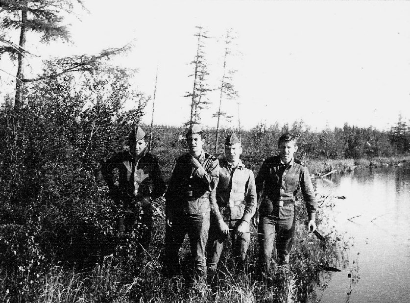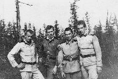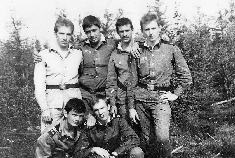 090 В тайге за ягодами. Слева-направо-сверху-вниз: Абакумов ? АХЧ, Яковлев Сергей радист, ?? банщик, Мякотин Анатолий дизелист, Грамма Федор сантехник, лето 1983 |