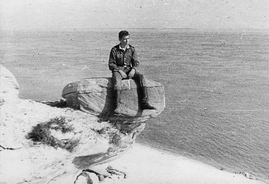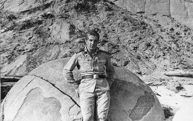083 Анатолий Мякотин у сферического камня на берегу р.Лены. Лето 1983 года |