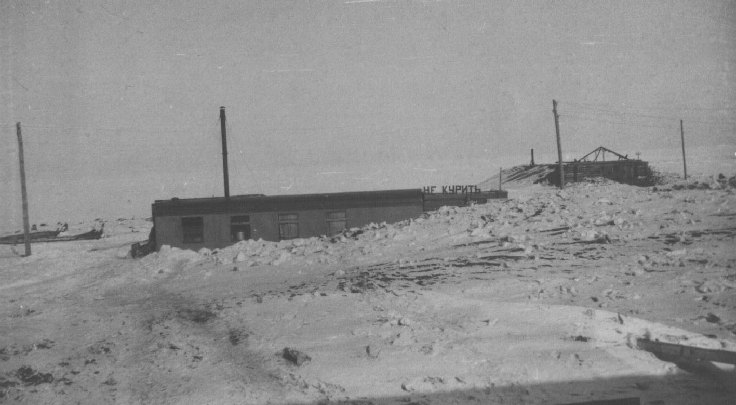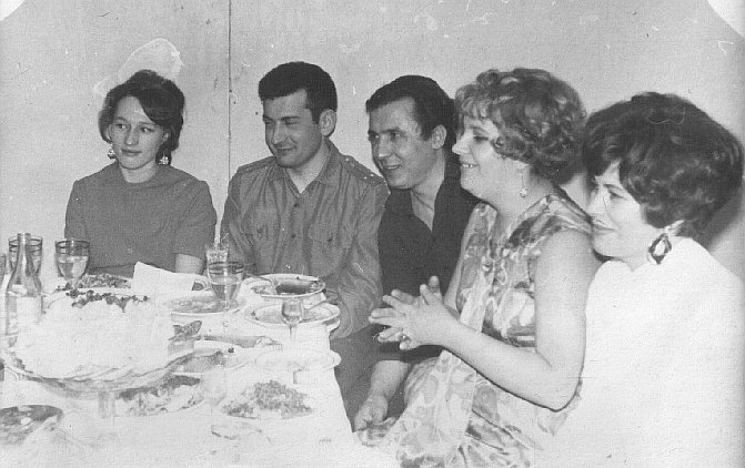 087 На переднем плане слева направо: жена работника годрографического предриятия, жена команди-ра В.Клевцова, жена В. Шанцева. Мужчины заняты едой |