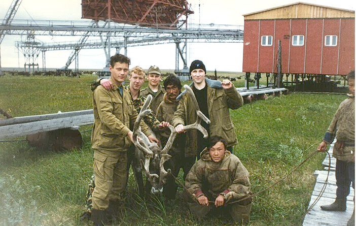 024 Слева-направо: Александр Бочкарев, Николай Чернышев, Александр Пшеничный, Николай Нагайцев. На заднем плане антенны в направлении "Чайка" |