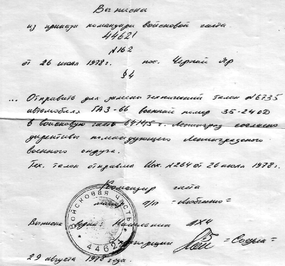 Эта справка использовалась для предъявления ВАИ, поскольку старые машины "Стрелы" не могли пройти техосмотр в местном гарнизоне