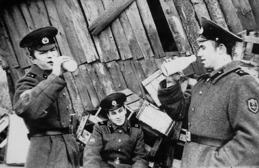 010 Вот такое безобидное начало первого увольнения нашего призыва, после которого трое или четверо угодили в комендатуру, а Парфенова (он на фото в середине, даже кефир не пьет) привезли гражданские. Он стоял возле их дома и не мог оторваться от стены. После этого в увал месяц никто не ходил... |