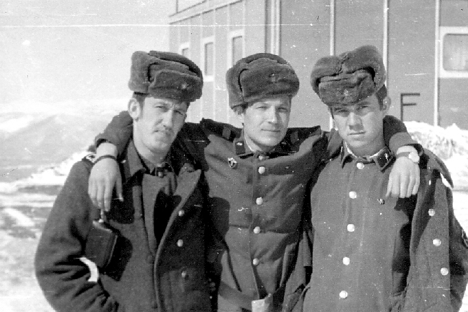 004 Мл. с-т Олег Антонов, нач. расчета л-т Шигаев и техник ДС с-т Шамкало. Декабрь 1971 года. |