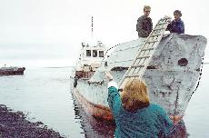 069 А.Никитин на разгрузке плашкоута. 1997 год |