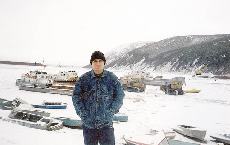 107 А.Никитин Н. в пос.Каменское. Зимняя стоянка барж на реке Пенжине. 1997 год |