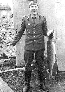 013 А.Кошелев демонстрирует обскую нельму весом в 10 кг. Июль 1979 года. Во время командировки на "Чайку".. |