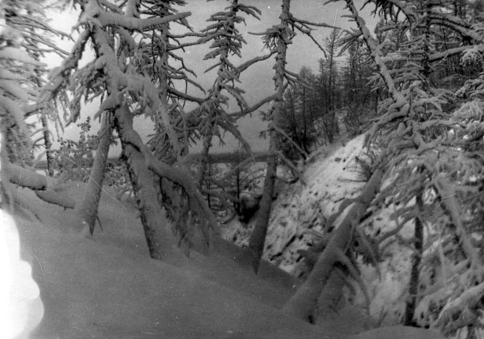 047 Зима 1968/69. Вид с площадки станции в сторону реки Лены. Темная полоса на горизонте - это противоположный берег реки Лена. |