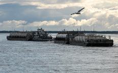 046 Доставка дизтоплива по Лене. Толкач ведёт наливной состав: одну баржу толкает перед собой, а две тянет за собой на буксире |