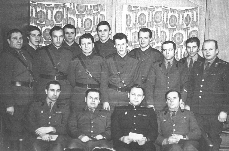 023 Стоят слева-направо: старшина, л-т Коровкин Ю., ст.л-т Веселов Анатолий, л-т Гончар, -, л-т Дмитренко, л-т Крюков,ст.л-т Песков, л-т Гусев, - . Сидят: К-н Богданович, - ,м-р Зименко, ст.л-т Царинник. |