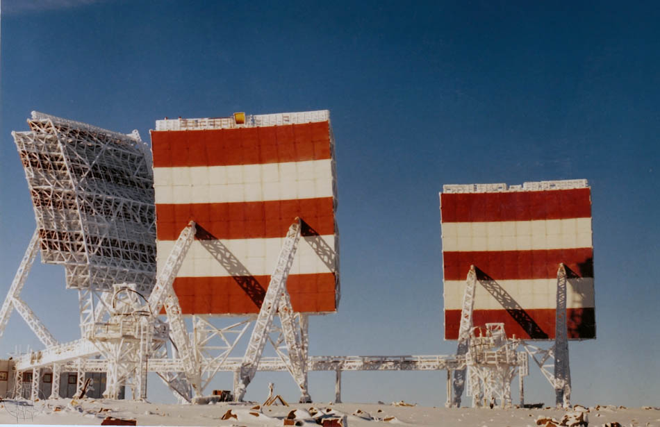Антенны ТРРС 11/103. Прямо на зрителя "смотрят" зеркала антенн южного направления. Слева, в боковом ракурсе, правая антенна направления на "Кварц"