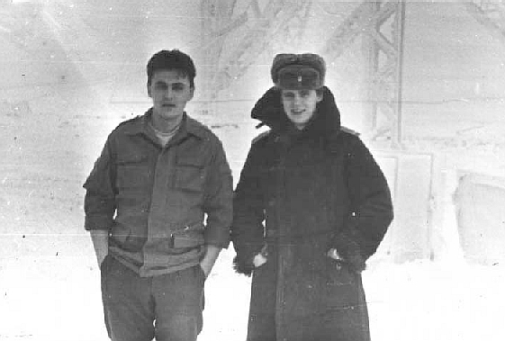 005 Механик дальней связи ряд. Милорадов (слева), начальник 4-го расчета л-т Карасев (справа) в техздании. 1989-1990.