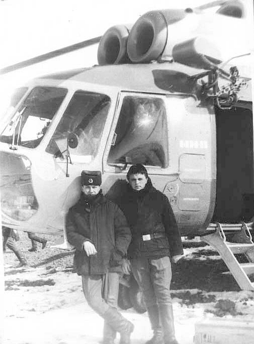 008 Ряд. Милорадов (справа) на фоне вертолета доставившего из пос.