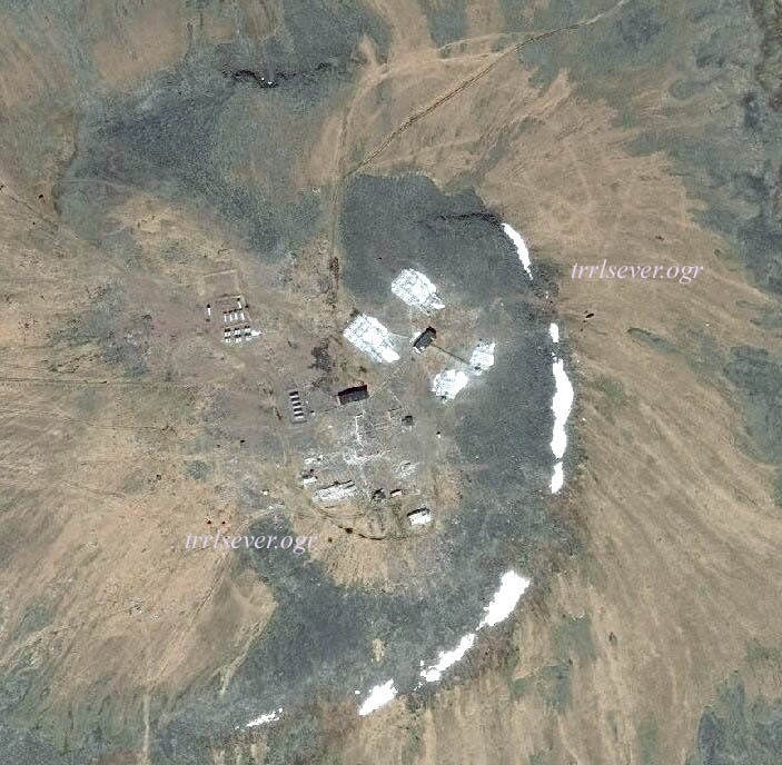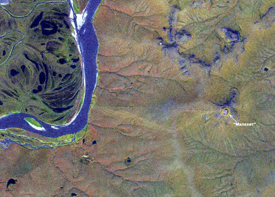 Общий вид участка местности включающий причал на берегу Индигирки, где разгружались танкеры, и с правой стороны главная площадка станции. Хорошо видна на снимке трасса трубопровода соединяющего цистерны на берегу и главную площадку. Расстояние от берега до станции - 11 км.