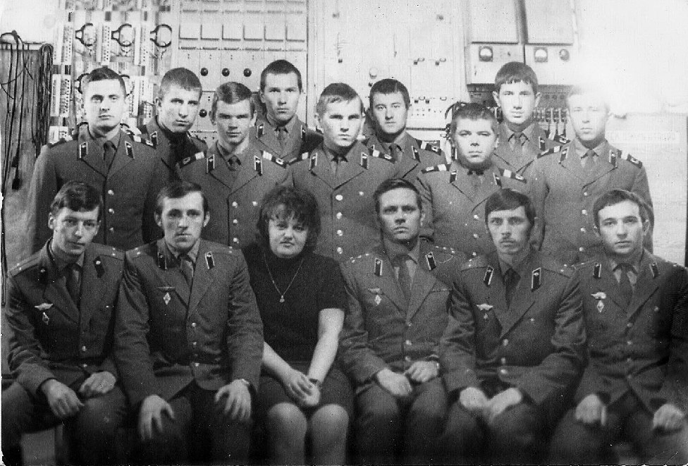 Сидят, слева-направо: сменный инженер л-т Иванов, сменный инженер л-т Блинов, техник ДС Люся Блинова, зампотех к-н Вичурин, сменный инженер л-т Плюснин, сменный инженер ст.л-т Каганов