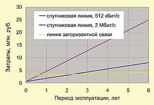 Из рисунка видно, что спутниковая линия связи со скоростью передачи 512 кбит/с с учетом арендной платы за частотный ресурс в течение первых трех лет эксплуатации экономически выгоднее линии загоризонтной связи. После указанного срока эффективнее становится использование тропосферной линии. При скоростях передачи на уровне 2 Мбит/с тропосферная линия становится экономически выгоднее уже после первого года эксплуатации.