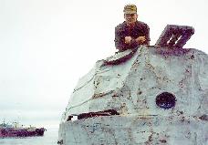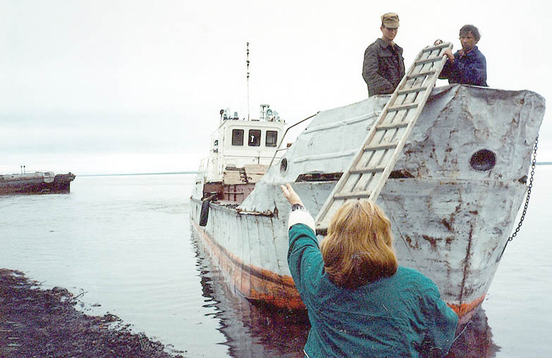 069 А.Никитин на разгрузке плашкоута. 1997 год |