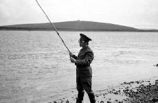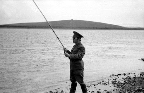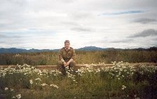 018 В.Чернов на фоне "Солдатской" сопки ловит хариуса возле аэропорта. Июль 1982г