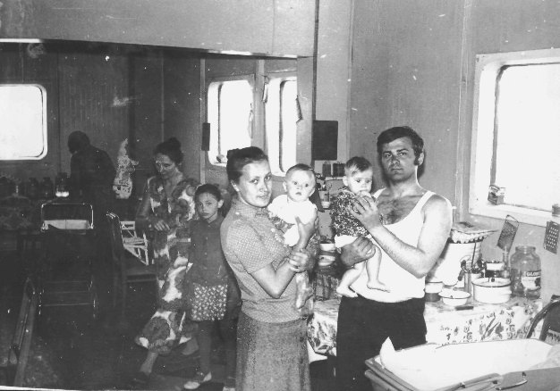 068 Общая кухня в общежитии Тулы, жена замполита Омельчук, их дочь, Галина Павлова с дочерью Олей, В.Логиновский с дочерью Леной. |