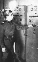 111 Дежурный техник-энергетик ряд. Савинов Л.Ю. запускает дизельгенератор. 1972 год |