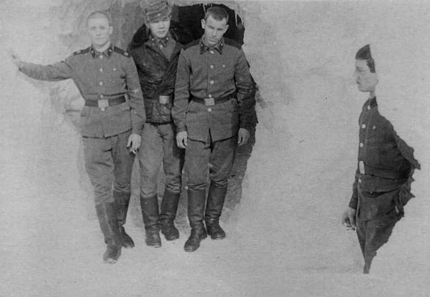 097 У входа в казарму: с права на лево энергетик мл.с-т.Савинов, радист мл.с-т. Лисневский, энергетик мл.с-т.Благирев, стрелок Гаврилюк,мл.с-т. ???? весна 1973г |