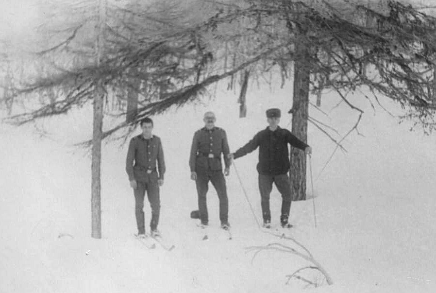 114 Лыжная прогулка: слева на право: ком.отд. энергетиков с-т.Савинов, стрелок Смирнов, киномеханник ??? |