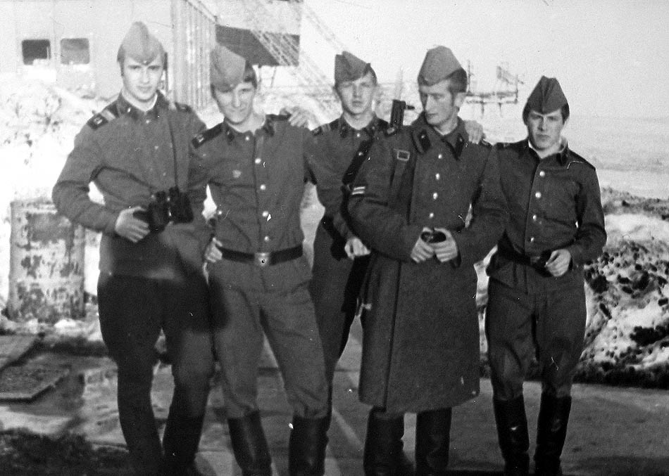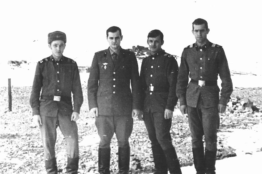 215 Лето 1976 года. На крыльце казармы. Ст.с-т Сергей Любченко, пр-к Приставка В.Ф., с-т Алексей Агальцов, ряд. Петр Новосад, ряд. Василий Хвостик |