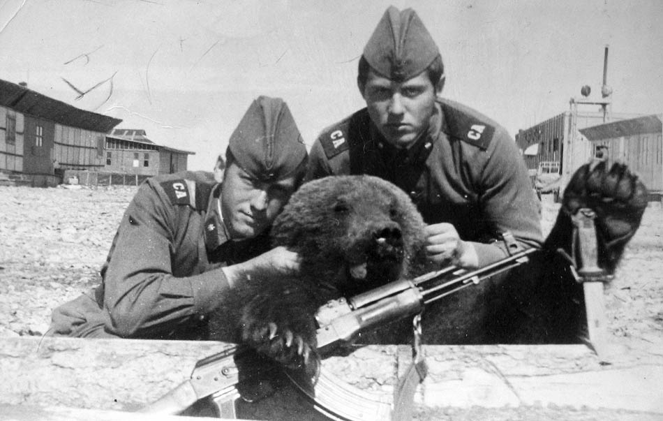 210 Лето 1976 года. С медведем Сергей Любченко и стрелок Владимир Неживенко. |