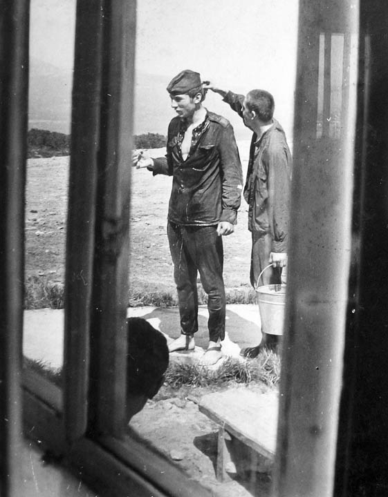 211 Лето 1976 года. С-т Александр Москаленко перегрелся, и Сергей Любченко поливает его водой. Кто-то подсмотрел в окно... |