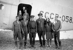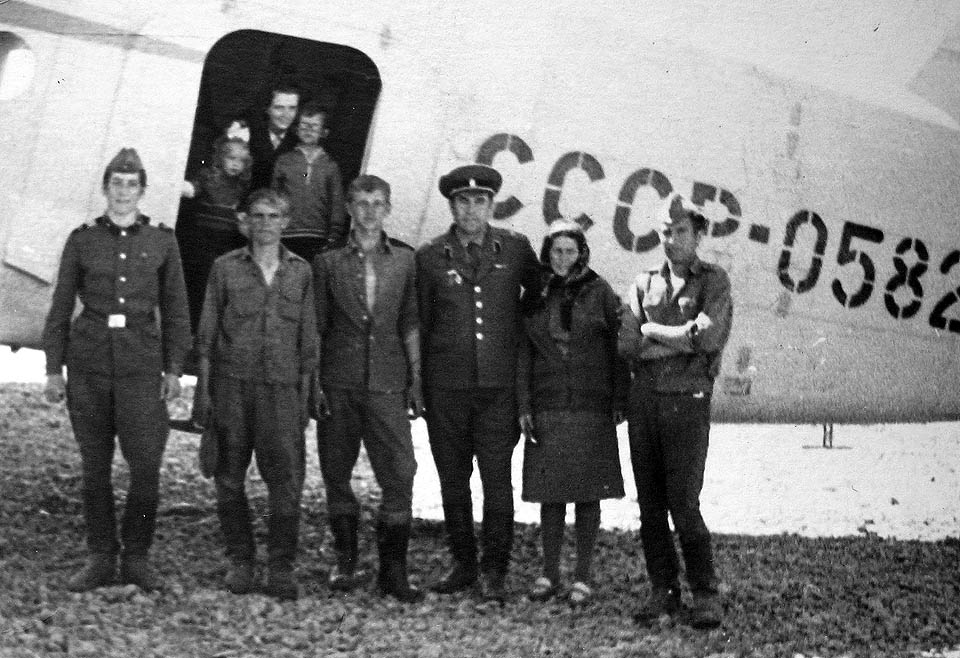 217 Июнь 1976 года. Перед убытием майора Каландария по замене в Брест. В самолете жена с детьми (сын Миша, дочь Аленка). Любченко, ряд. Ковалев, с-т Берлов, м-р Коландария, женщина из пос. Тахтоямск, тракторист Усманов . |