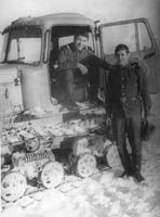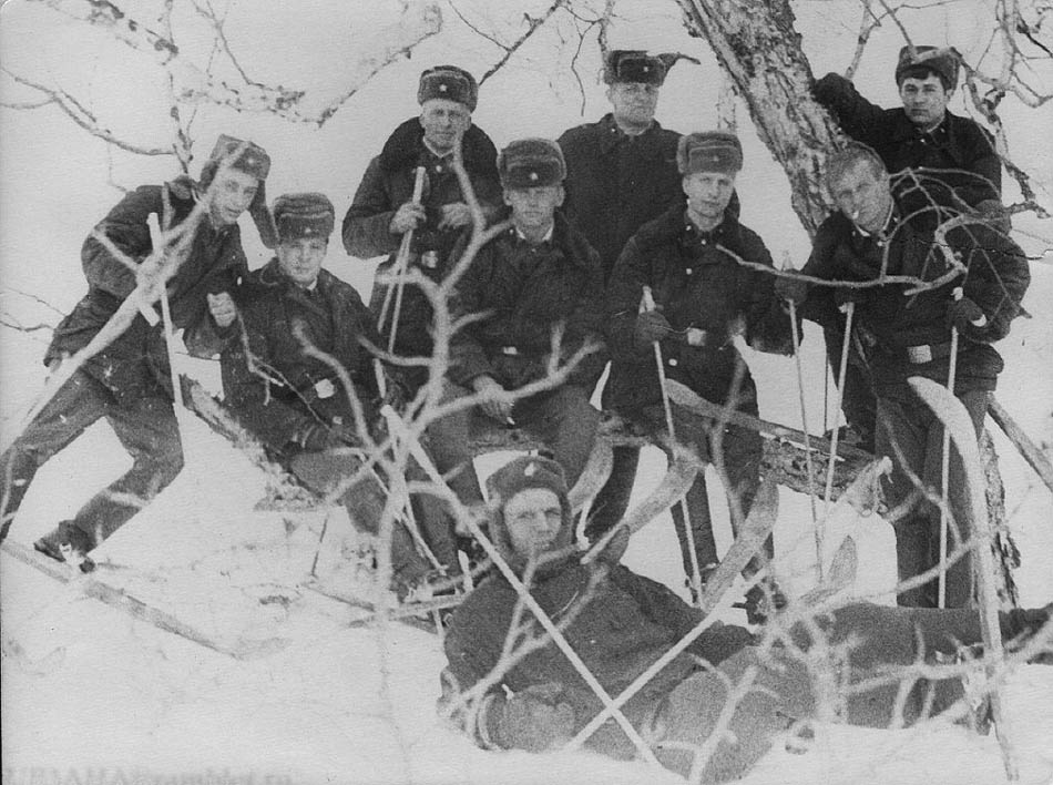 231 Лыжная прогулка, привал. слева-на-право стрелок ряд. Чайнюк Григорий, 2-й, 3-й и 4-й трактористы, 5-ый в шапке с ухом дизелист с-т.Савинов Леонид, 6-ой радист Самсонов, 7-ой автотехник, 8-ой радист Маркин Владимир. лежит - повар Нехорошко.1973 год |