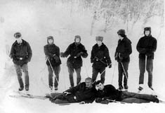 235 Лыжная прогулка. Слева на право: тракторист ???, повар Нехорошко, радист с-т. Самсонов, ???, ???, последний - дизелист с-т.Савинов Леонид. Лежат: слева автотехник и радист Маркин Владимир.1973 год |