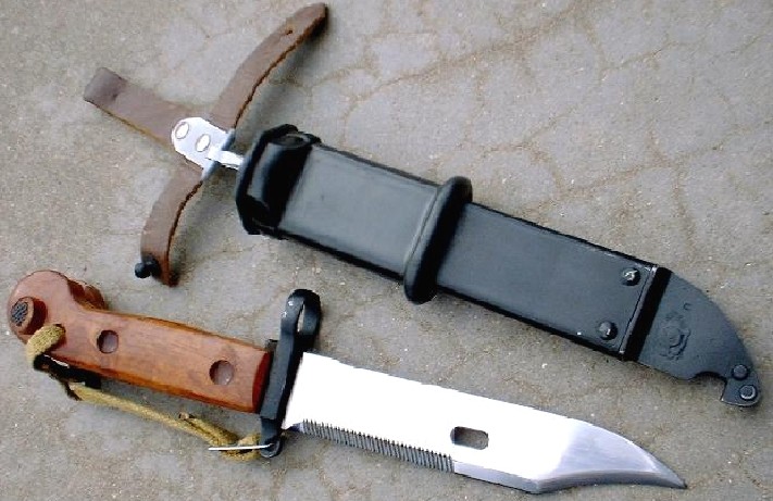 Клинок однолезвийный, боевой конец двулезвийный, с вогнутым лезвием со стороны обуха. На обухе имеется насечка в виде зубцов, позволяющая использовать штык для пе-репиливания стальных прутьев. В передней части клинка имеется сквозное овальное отверстие. Рукоять образована двумя пластмассовыми щечками, скрепленными с хвостовиком клинка двумя заклепками. Приспособления для крепления на автомате состоят из кольца в крестовине для надевания на ствол и Т-образного паза с пружинной защелкой в головке рукояти. Кнопка пружинной защелки ограждена пластмассовым буртиком. Ножны стальные. Верхняя часть ножен закрыта резиновой накладкой с ограничителем для обхвата рукой при перекусывании проволоки, находящейся под напряжением. В нижней части ножен имеется овальный штифт, а на конце ножен — фигурный вырез. При накладывании клинка овальным отверстием на штифт штык превращается в ножницы для резки проволоки, которая перекусывается в фигурном вырезе при повороте клинка вокруг штифта.